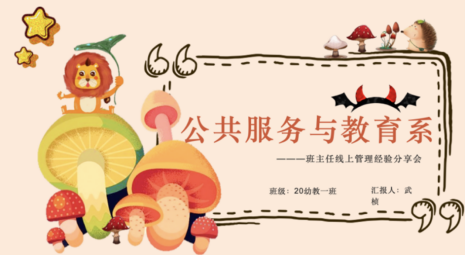 公共服务与教育系2020级幼教一班班主任武桢老师从主要工作措施、日常活动安排、活动效果3个方面作分享,干货满满,新颖实用。武桢老师将“班委责任制”、“积分透明化”、“家校联合”三个管理手段进行组合,全方位地提高了班级线上管理的效率。